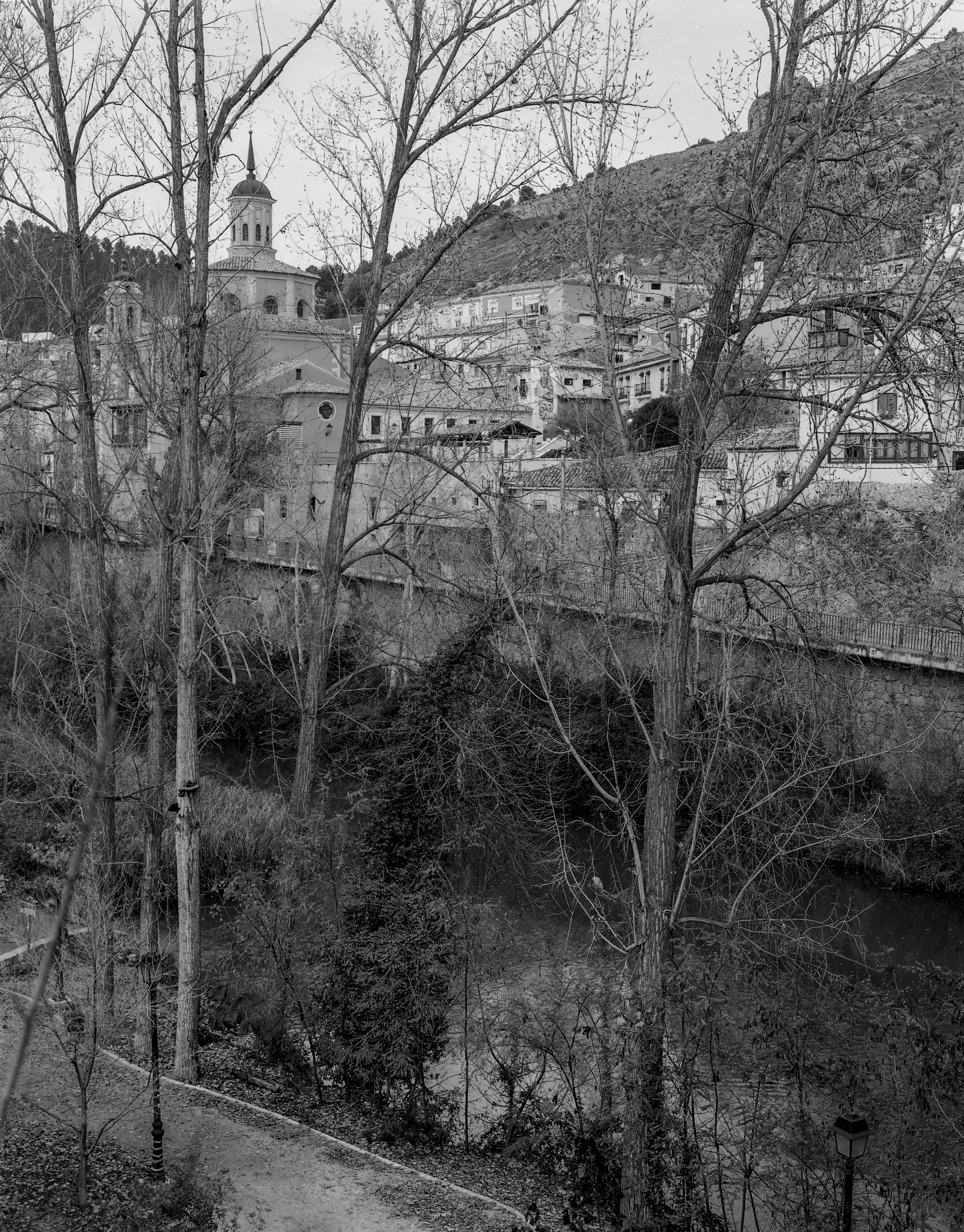 Y para finalizar, con poca luz, disparando a 1/4 de segundo, un fotografía de la Iglesia de la Virgen de la Luz, apenas visible entre las ramas cadavéricas de los álamos de la ribera del Júcar.