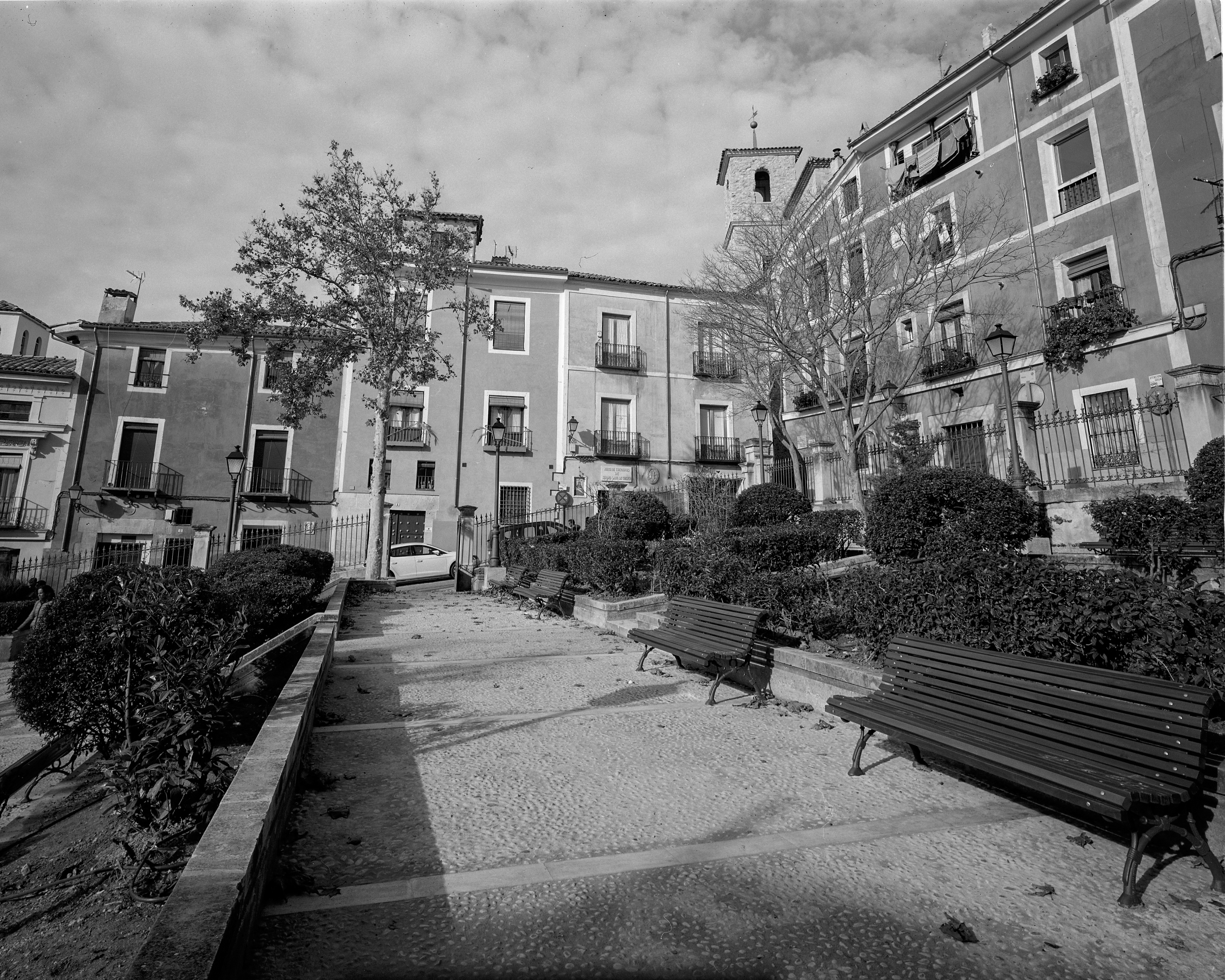 Entre tanto, iban llegando las anunciadas nubes. Bajamos la cuesta de subida al Parador y nos encaminamos al barrio de la Parroquia de El Salvador. Cerca de la iglesia hay un parque recogido entre casas pintadas de colores que, pese a llevar blanco y negro, tenía ganas de fotografiar. Esta vez, de nuevo, con el Nikkor-SW 65/4