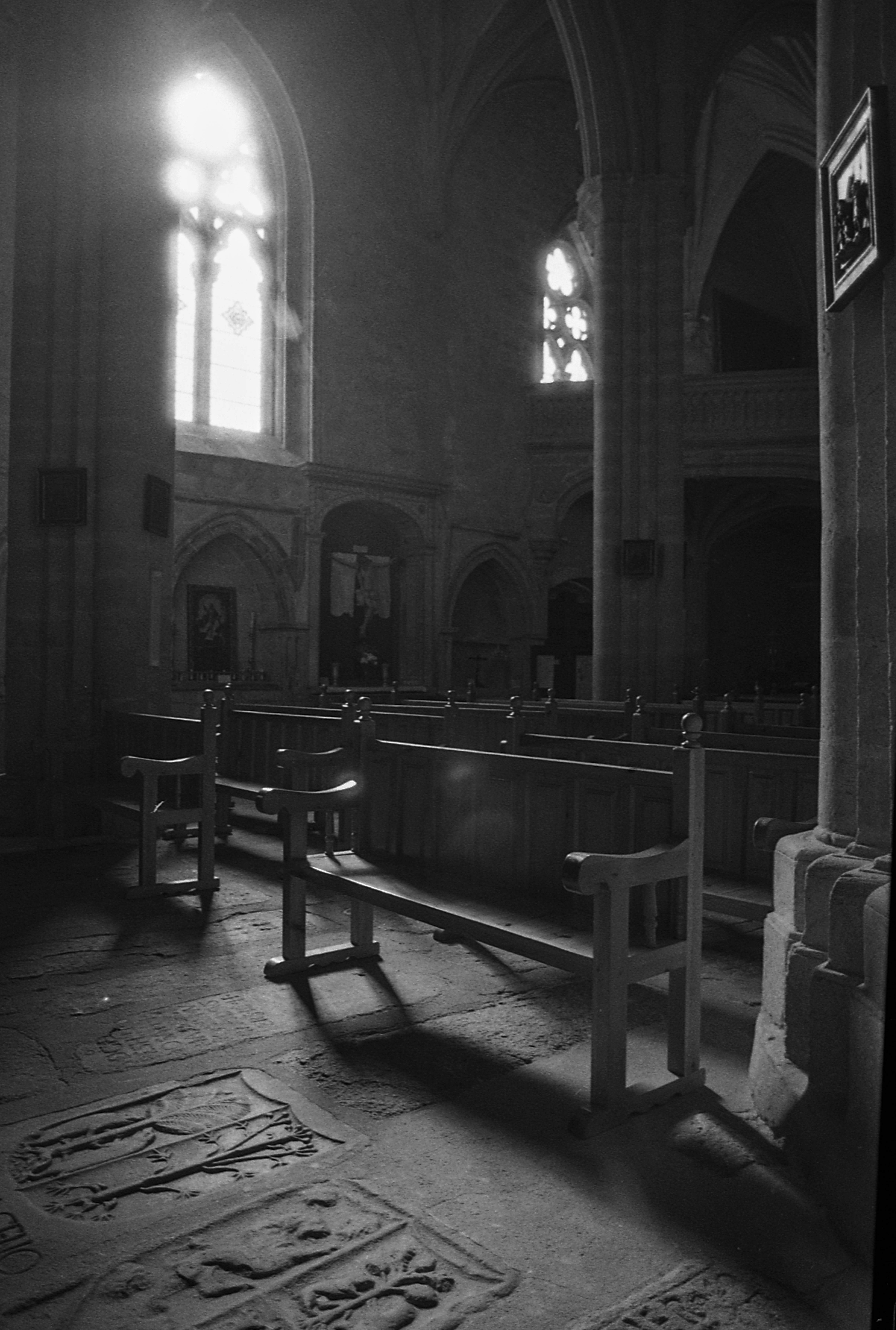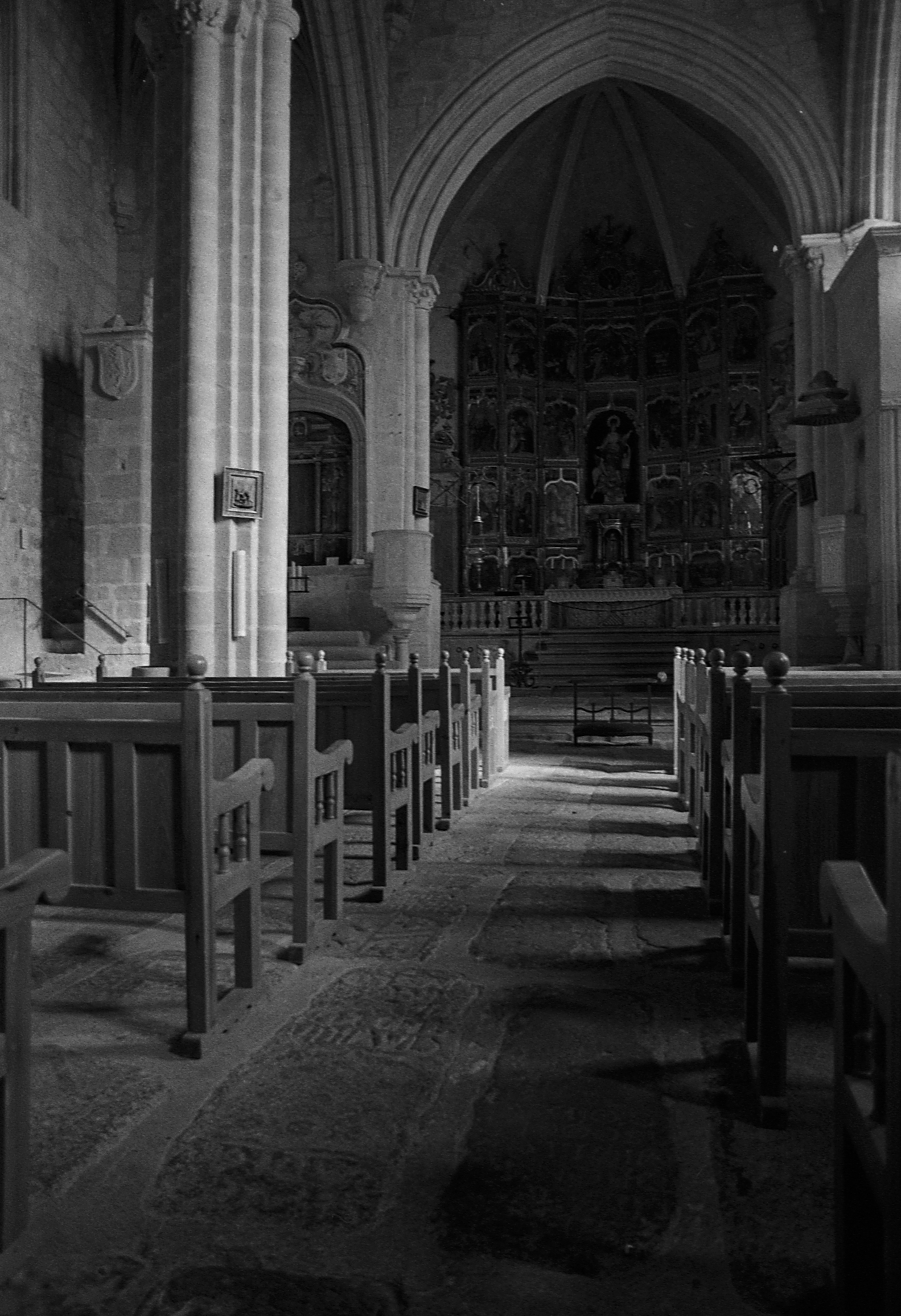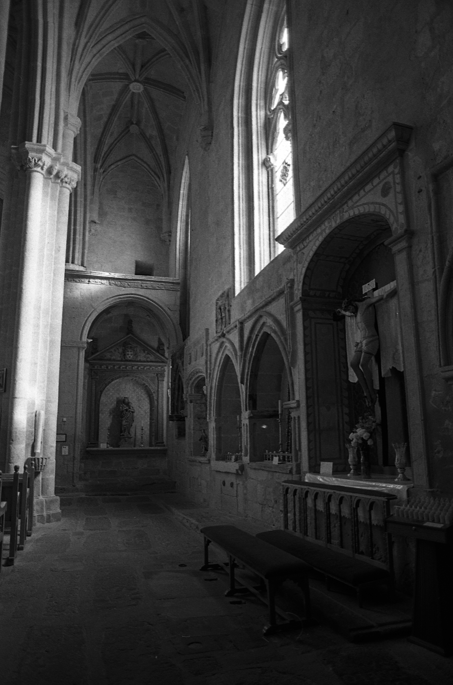 El rosetón de la fachada de poniente, pero sobre todo los ventanales de la de mediodía me regalaron la luz suficiente para disparar tres fotos a pulso, de nuevo con la Nikon FA. El APX 400, como se ve, no destaca por su contraste algo que, no obstante, no me disgusta.