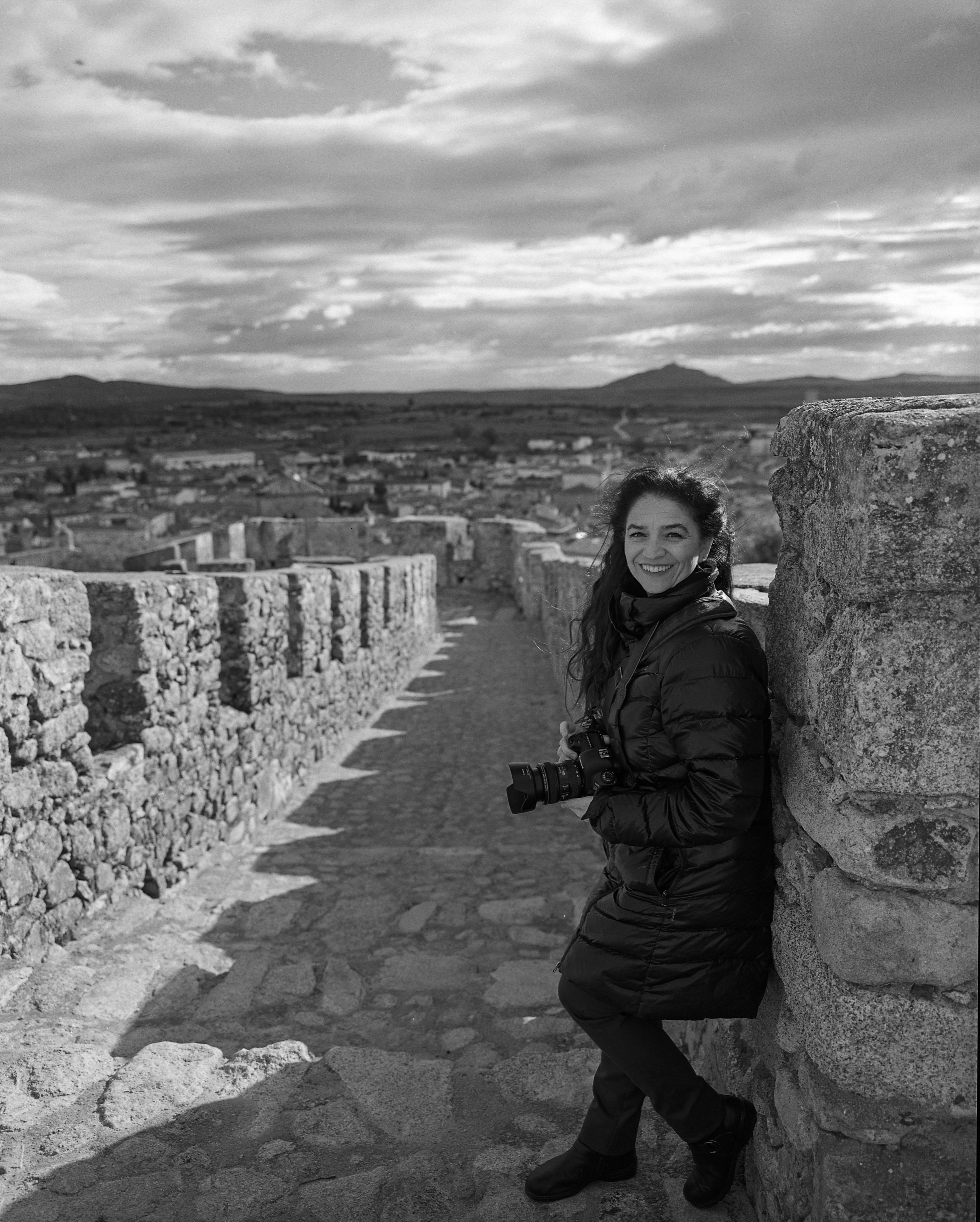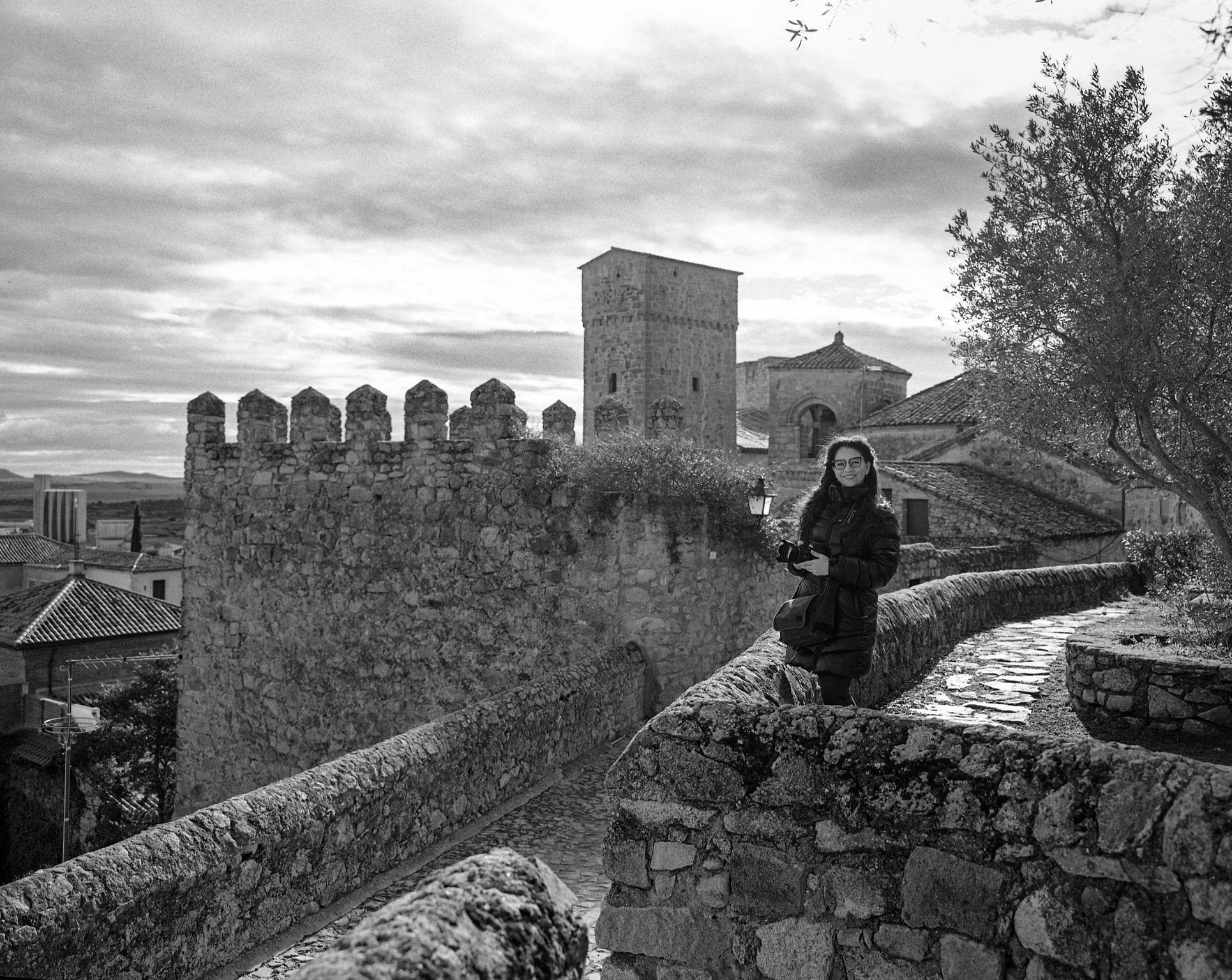 Y un retrato, el de mi señora ¡nada menos! Cambié al 55mm y disparé sin acercarme demasiado por no deformar la imagen aunque buscando alargar el magnífico adarve de la muralla … estirar la fuga hacia el horizonte. Ummmm.