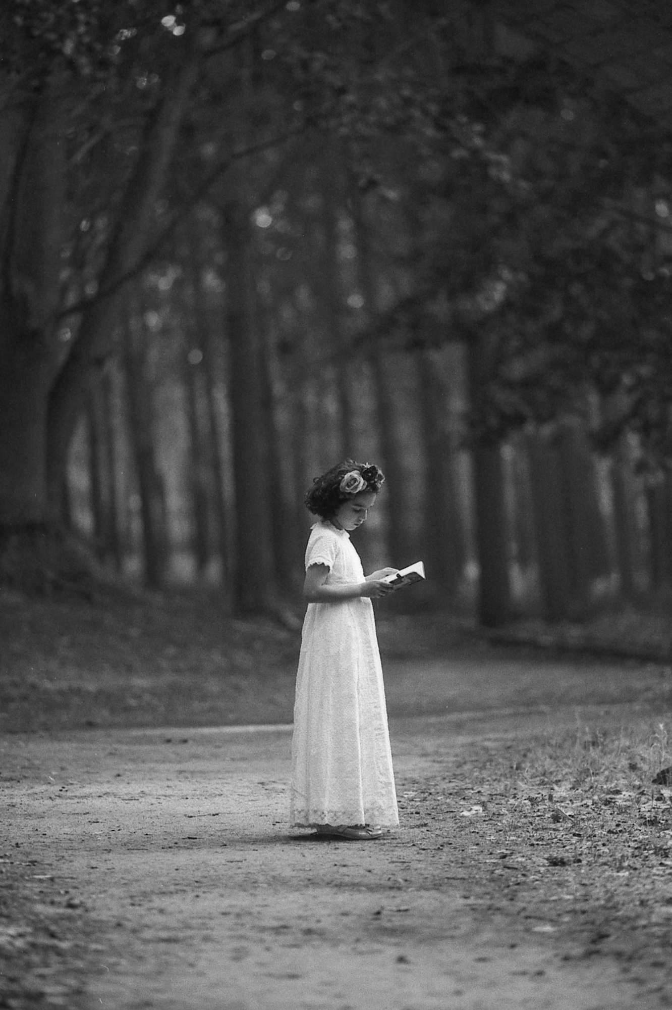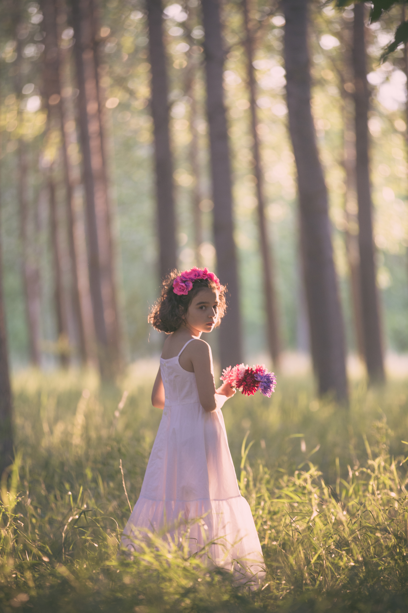 Con esa idea, el destacar el aire «vintage» del vestido y de la propio Violeta, escogimos como entorno una alameda cercana a casa. Las tardes de verano regalan una luz maravillosa con la que imaginamos varias escenas. La fronda es densa, pero la luz baja de la tarde consigue filtrarse para ofrecer un fondo que hace filigranas de luz con las aperturas más arriesgadas. Esos desenfoque, el bokeh, ay, sigue siendo uno de nuestros «motivos» favoritos.