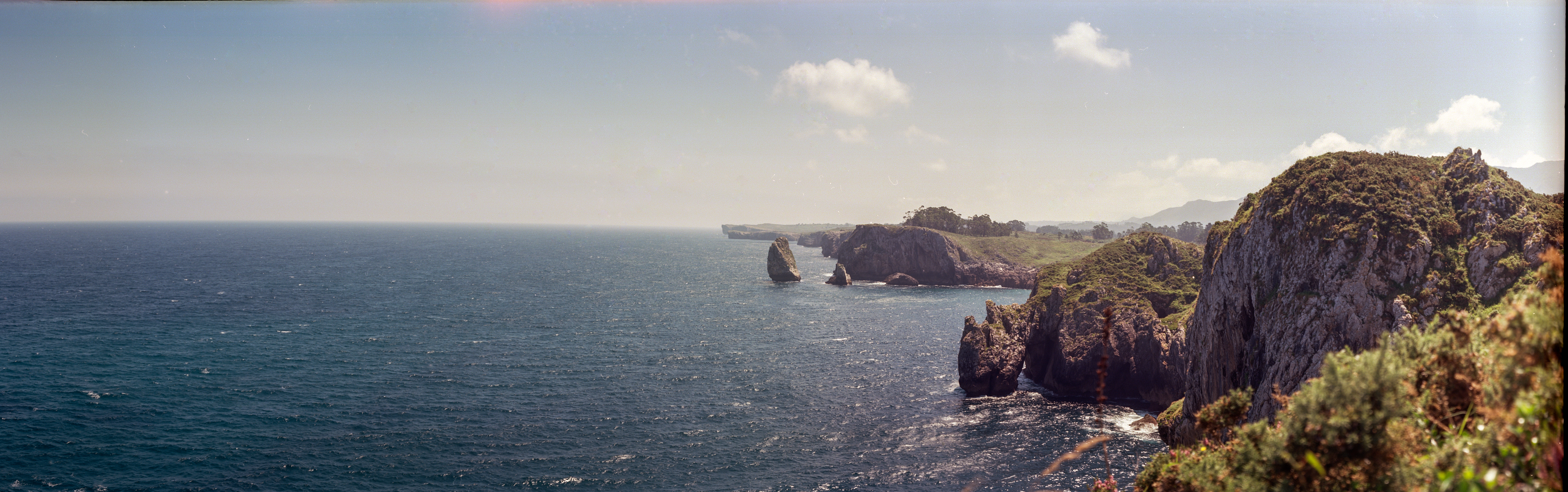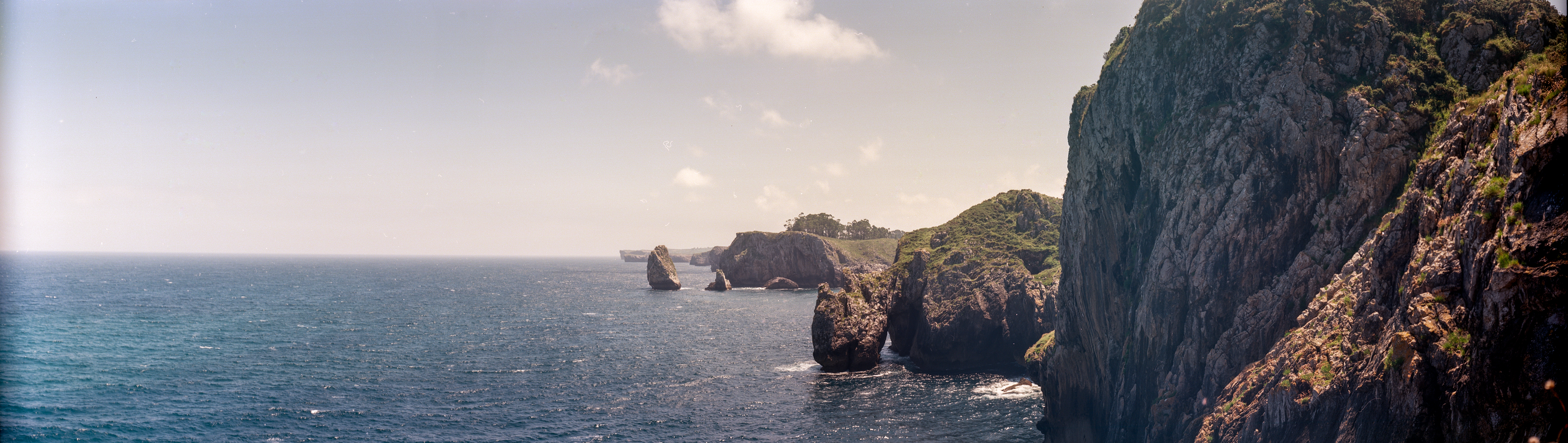 Primeras fotos: los acantilados del Infierno, muy cerca de Ribadesella. Mañana luminosa, mucho, ideal para comprobar que el objetivo tiene una apertura que ronda f/11 y el obturador una velocidad de 1/50, esto es, la rápida, la que más me interesaba. Disparé Ektar 100 … ya sé, ya sé, la «sunny» superada por dos pasos, tal vez algo menos. Nada para la latitud de película, jeje.