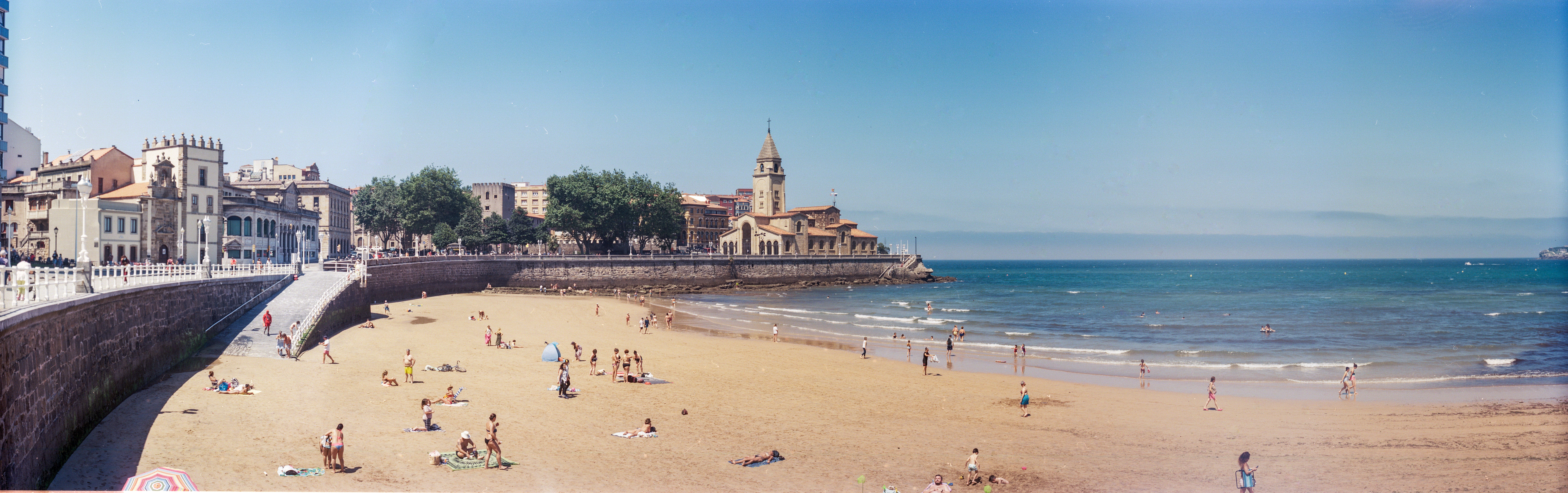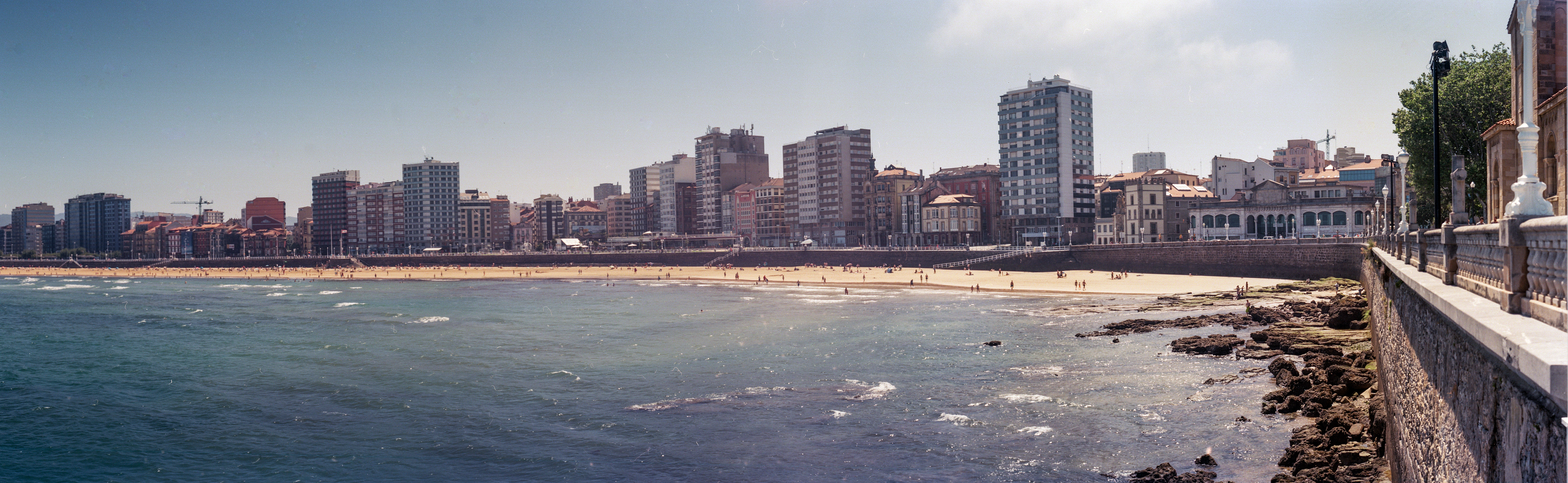 Mañana en Gijón. Espléndida, incluso con el resol que se aferraba a la neblina de la mañana. Paseo por el de la playa de San Lorenzo; el casco antiguo de la ciudad; el puerto; Cimadevilla … y hora de comer. El caso es que a esa hora, sin un plan, preguntamos a The Fork y a algunos viandantes. Tras un par de tentativas (hora punta), acabamos en la Taberna del Piano. Segunda carambola. Llevaba en la mano la Leica IIIf con el Summaron 35/3.5. Llamó la atención de un cliente del restaurante que no dudó en preguntar si efectivamente era una Leica de las de antes. Charlamos. Me contó que retrató a Cruyff con una Barnack hacía muchos, muchos años. Otra carambola. Como fotógrafo profesional pudo haberme contado sobre muchas otras fotografías, sin embargo se acordó de una en particular, la que hizo de la playa con una Kodak antigua, una panorámica que producía un negativo de 6×18 … «como esta», le dije, mientras sacaba a la viejita de la bolsa «¡¡¡¡Sííííííííí!!!!». Jajajajaja, nos faltó una abrazo, caray. El destino entreteniéndose con pequeña anécdotas.