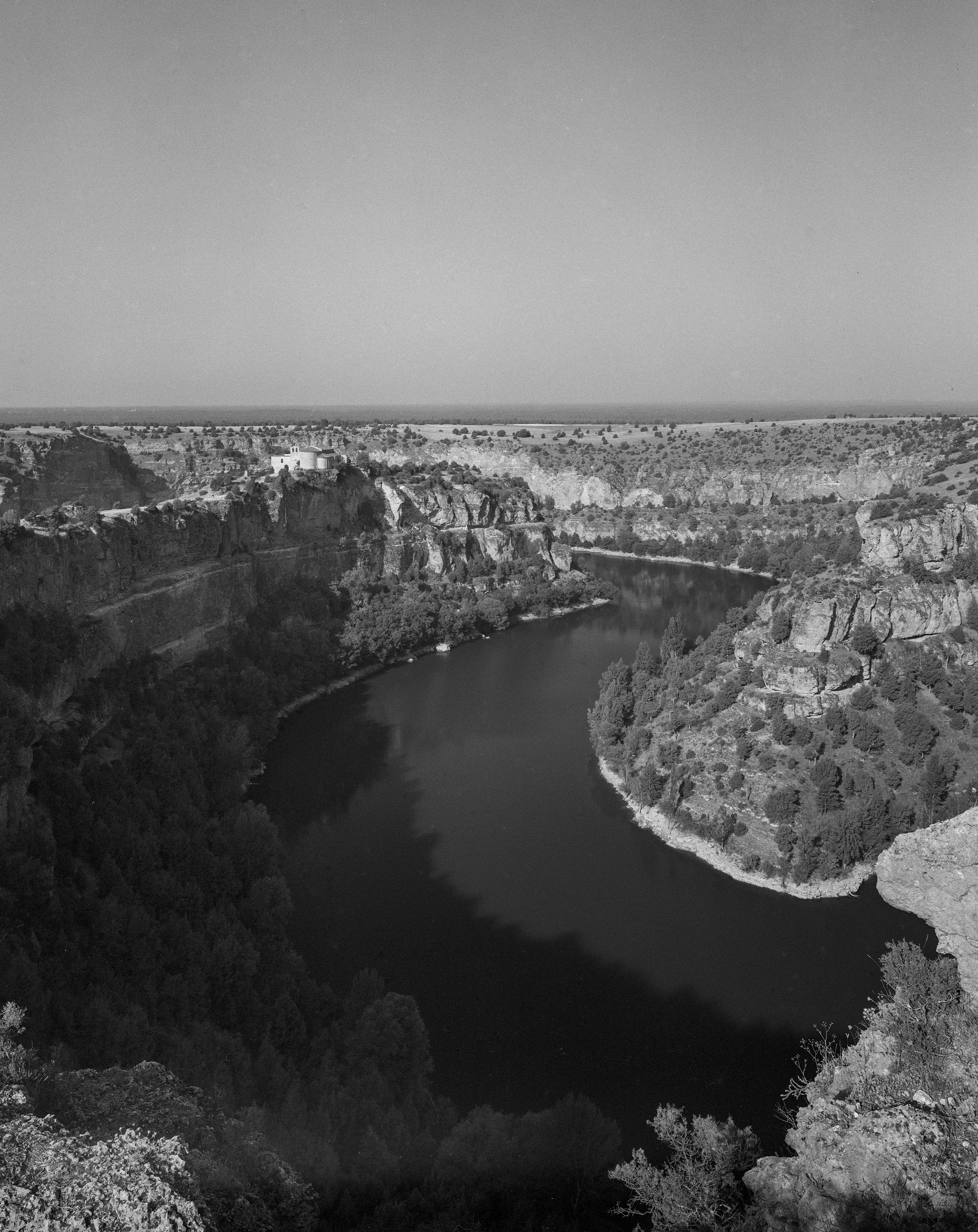 Y finalmente tiro de «gran angular» (equivalente a un 24, aproximadamente) para encuadrar el trazado sinuoso del meandro que deja el Duratón una vez superado San Frutos. Sinaron 75/6.8 y filtro amarillo.