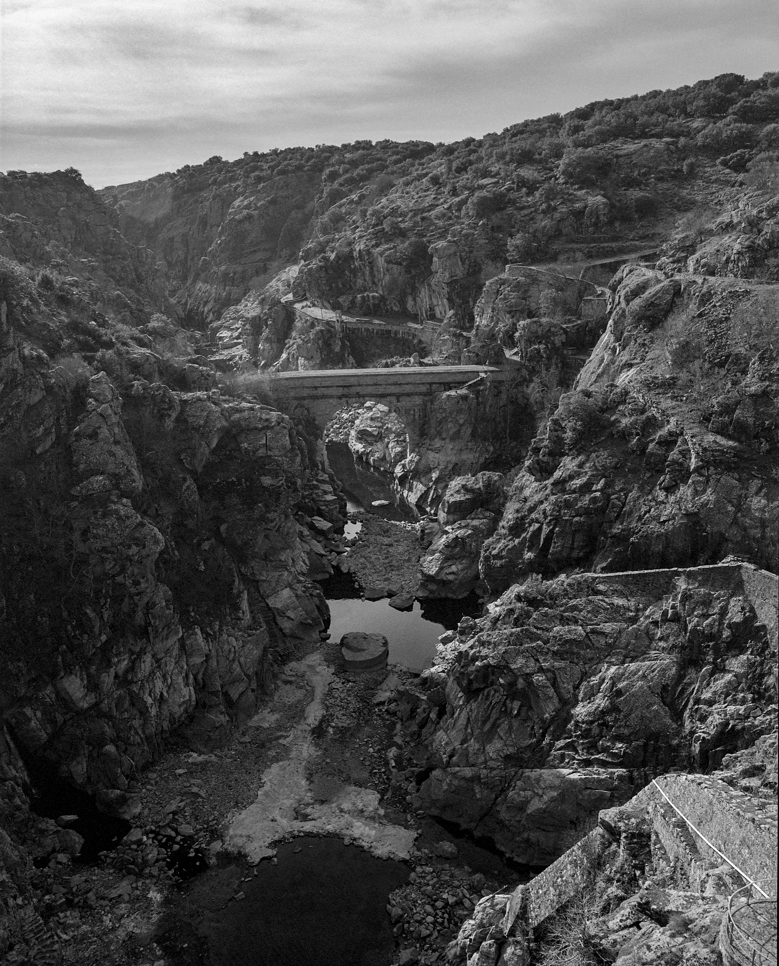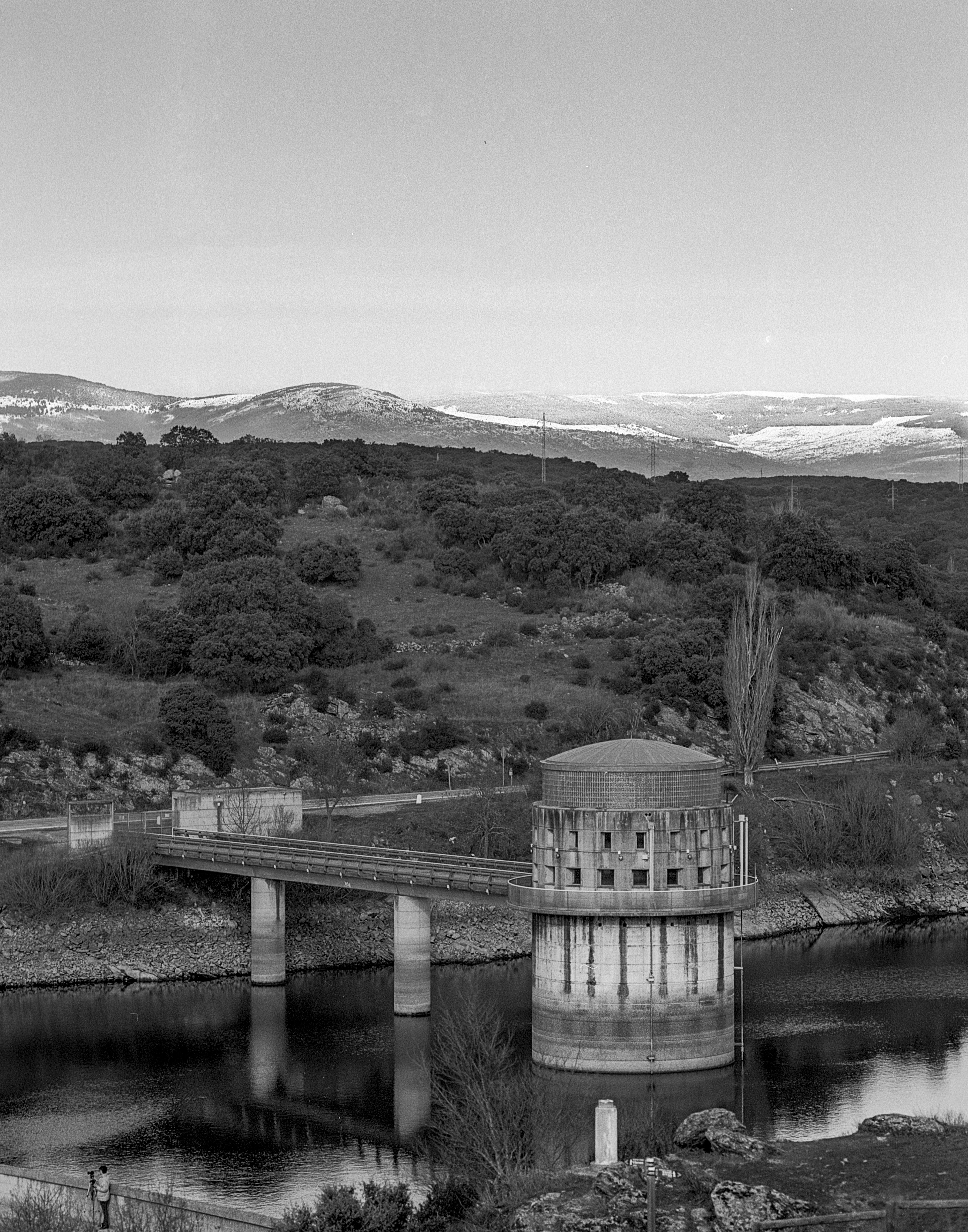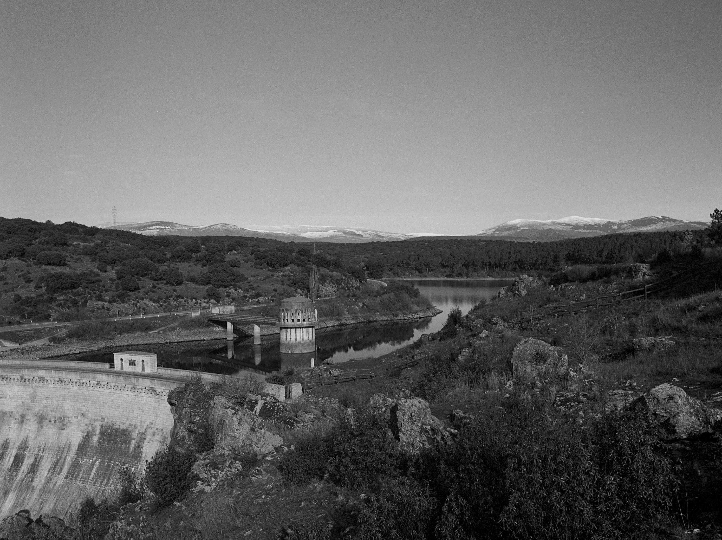 Llegué a la presa sobre las 10 de la mañana. Una mañana brumosa, con una luz que no facilitaba contraste alguno. Esperé a que el sol asomara sobre la presa, que se sacudiera la bruma y me regalara texturitas, matices … porque, ay, lamentablemente el cauce del río está en mínimos. Es más piedra que río. Una fisonomía áspera que contrasta con la del embalse y sus orillas y esos horizonte de cerros y sierras nevadas.