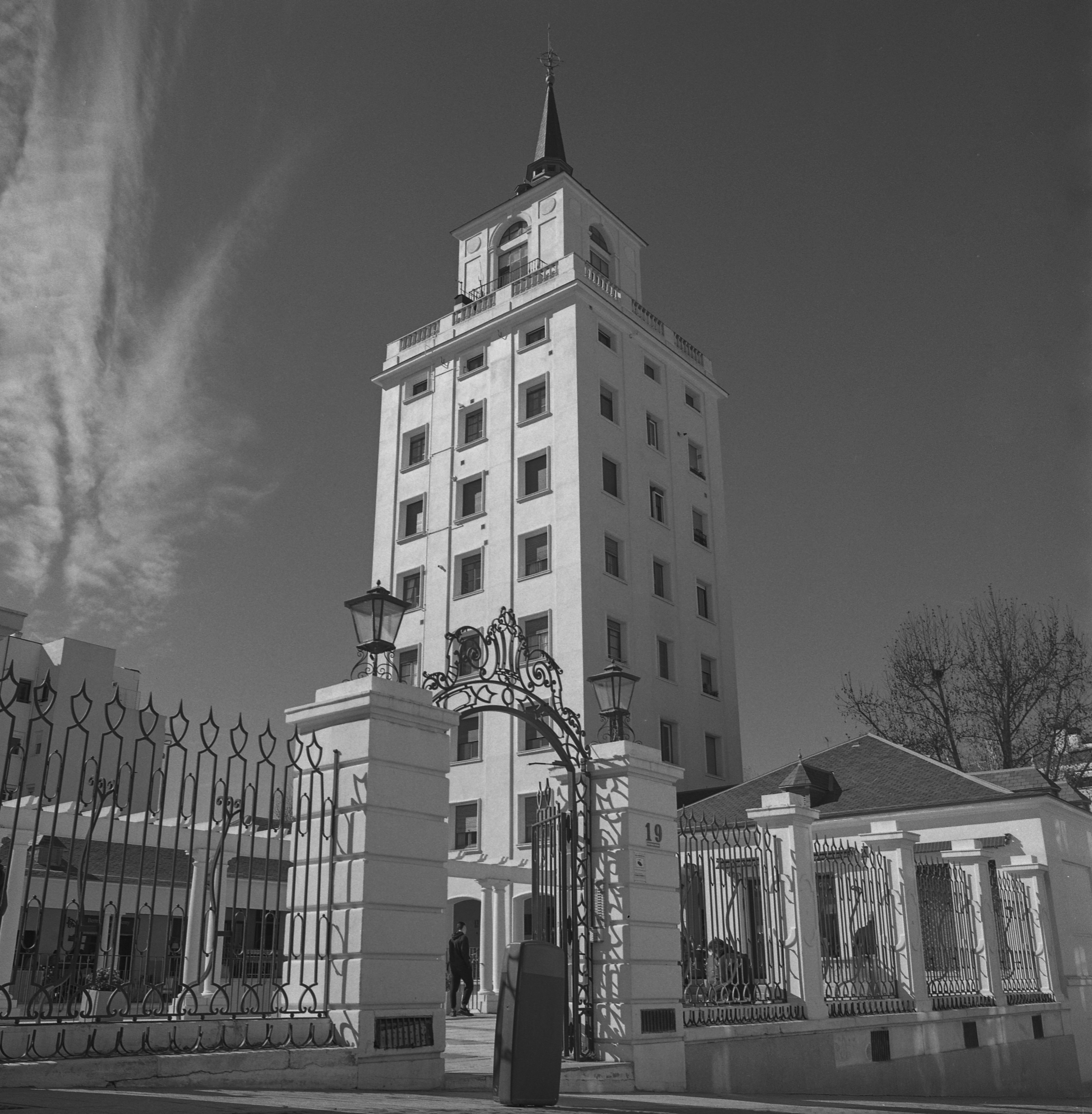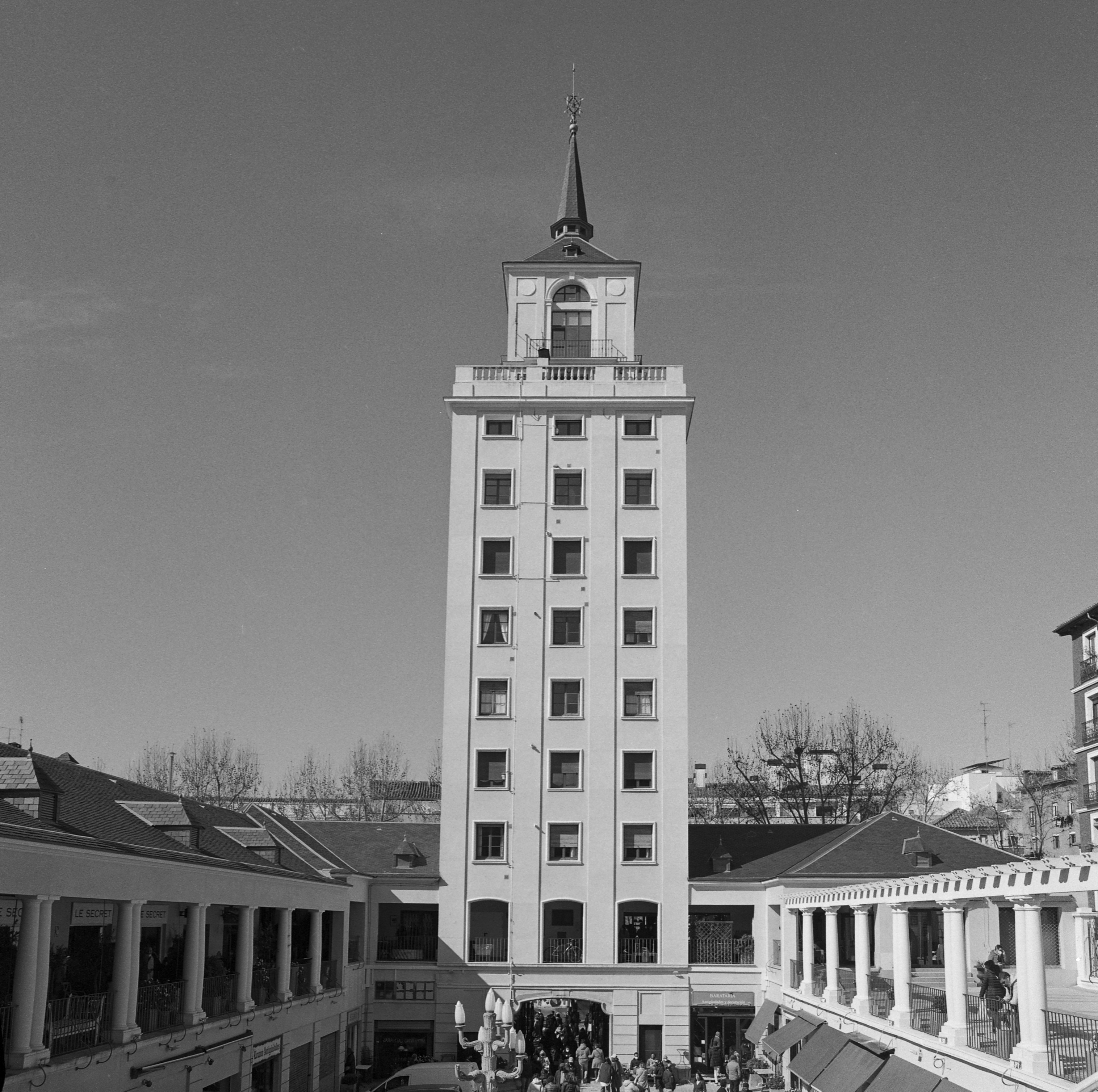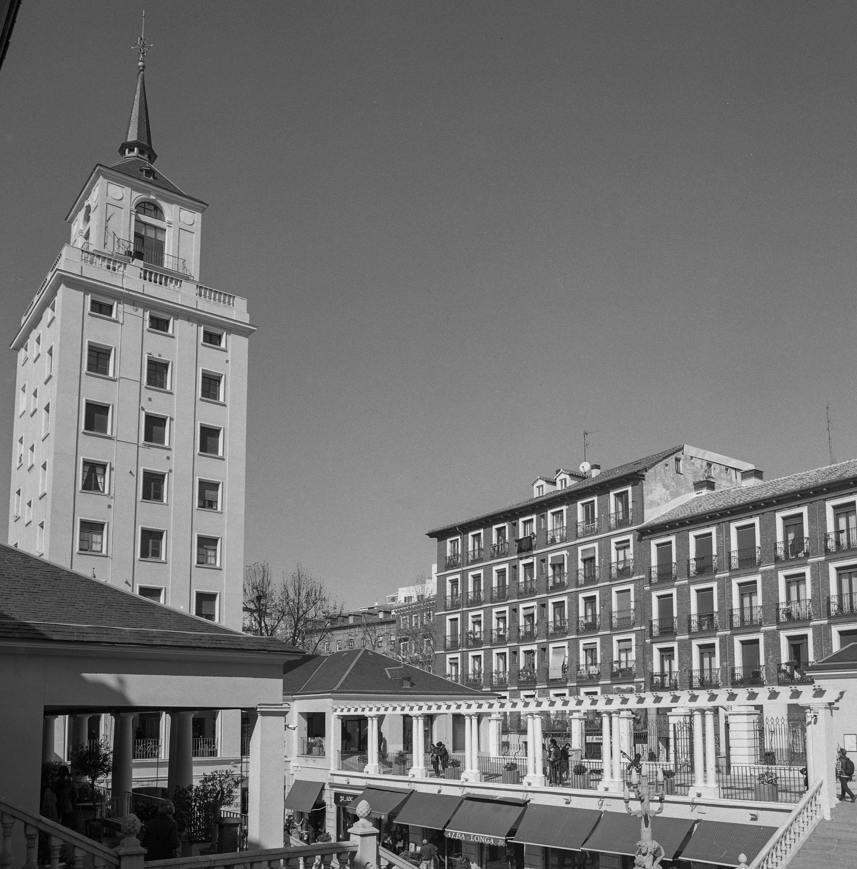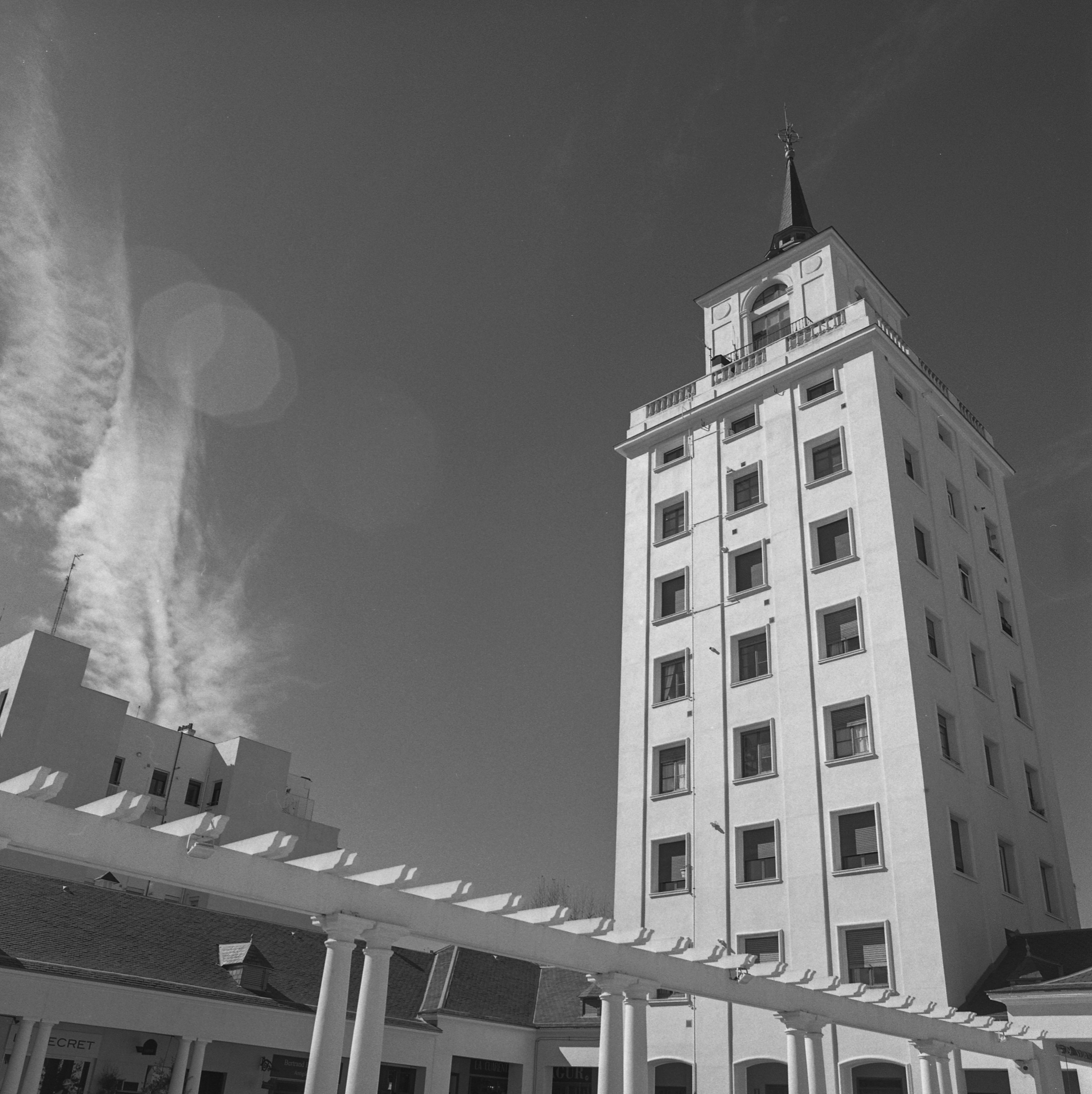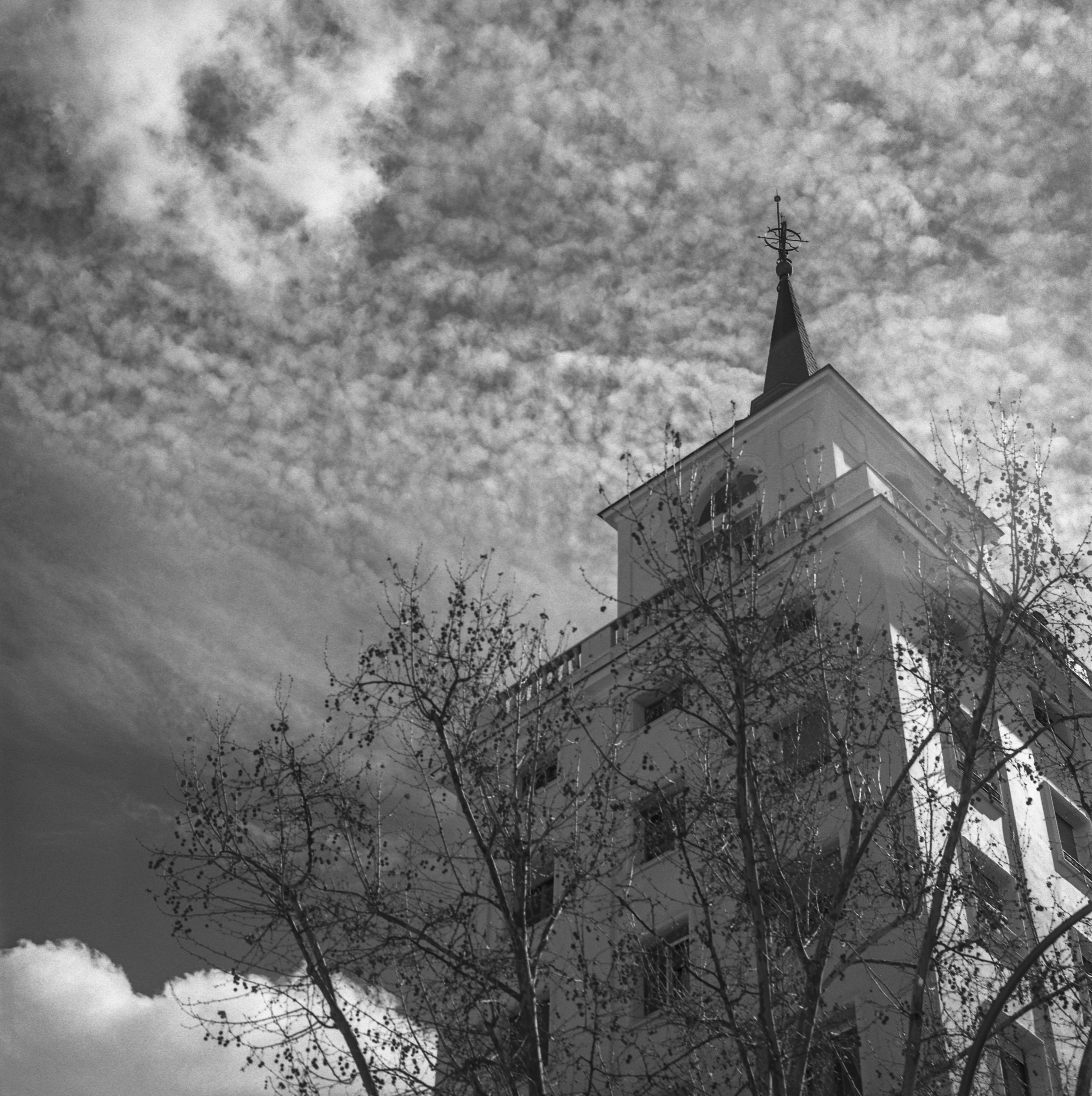 Unas últimas fotos de la torre de las Galerías Piquer, esta vez con el 100/2.8 (Rollei Retro 400s). La torre parece querer arroparse con un echarpe celestial, un adorno muy al estilo de la mejor Piquer, supongo 😉