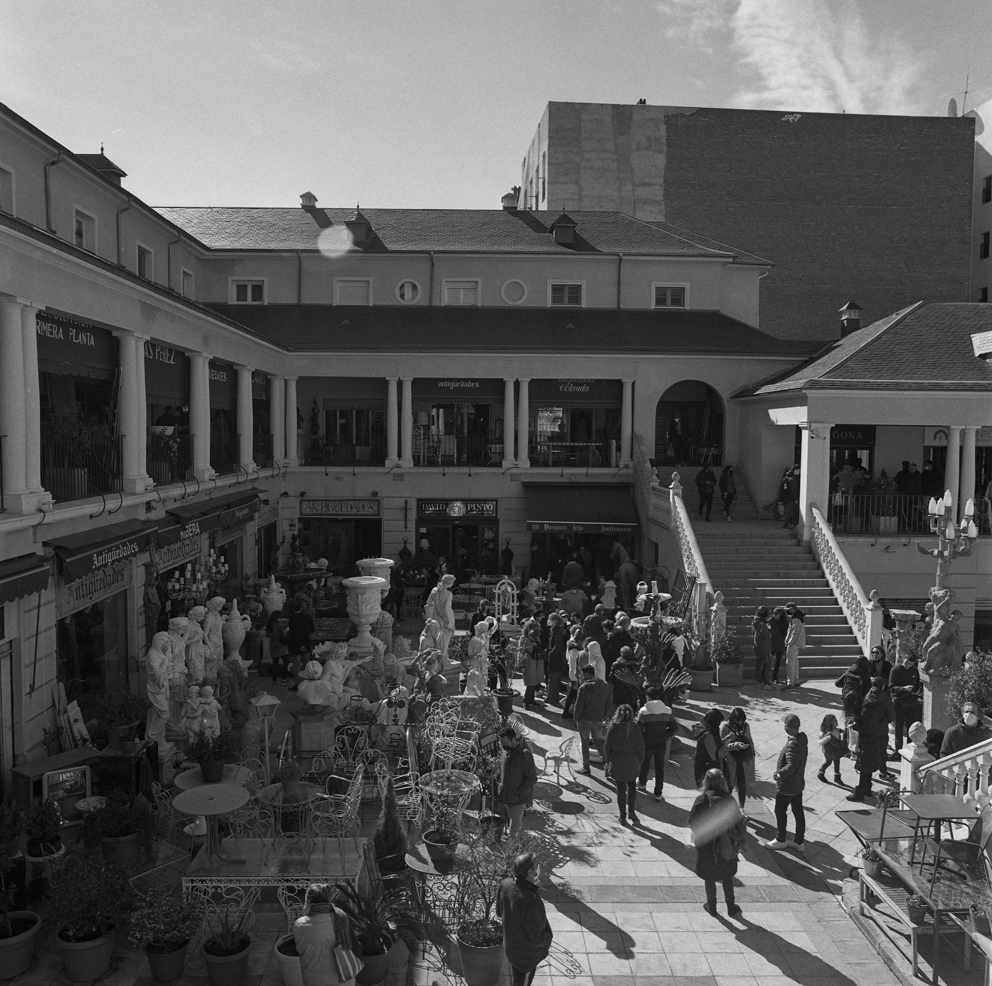 La luz del Rastro en invierno, que es la luz del Madrid, claro, es un lujo que invita a madrugar en domingo, «el día que todos los madrileños desean asomarse al Rastro por si se encuentra una ganga. Pero no hay gangas en el Rastro. Esta es la verdad. Sólo encuentran los necesitados lo que requiere su necesidad y los nuevos ricos antigüedades prefabricadas«. Yo le diría a Juan Antonio Cabezas que lo mío son las fotos, hacerlas, fotos casi prefabricadas, sí, de lo mucho que se repiten. Je. Pero, curiosamente, salvo un par que hice hace dos o tres años con la Altissa, nunca había fotografiado las Galerías Piquer. En esta ocasión llevé la Bronica S2A con dos focales: Zenzanon 50/2.8 y Zenzanon 100/2.8. Ah, y filtro naranja. Además, para hacer fotos del ambiente, ese que en las galerías se hace un remanso, también metí en la mochila la maravillosa Olympus Pen D (con su magnífico F.Zuiko 32/1.9).