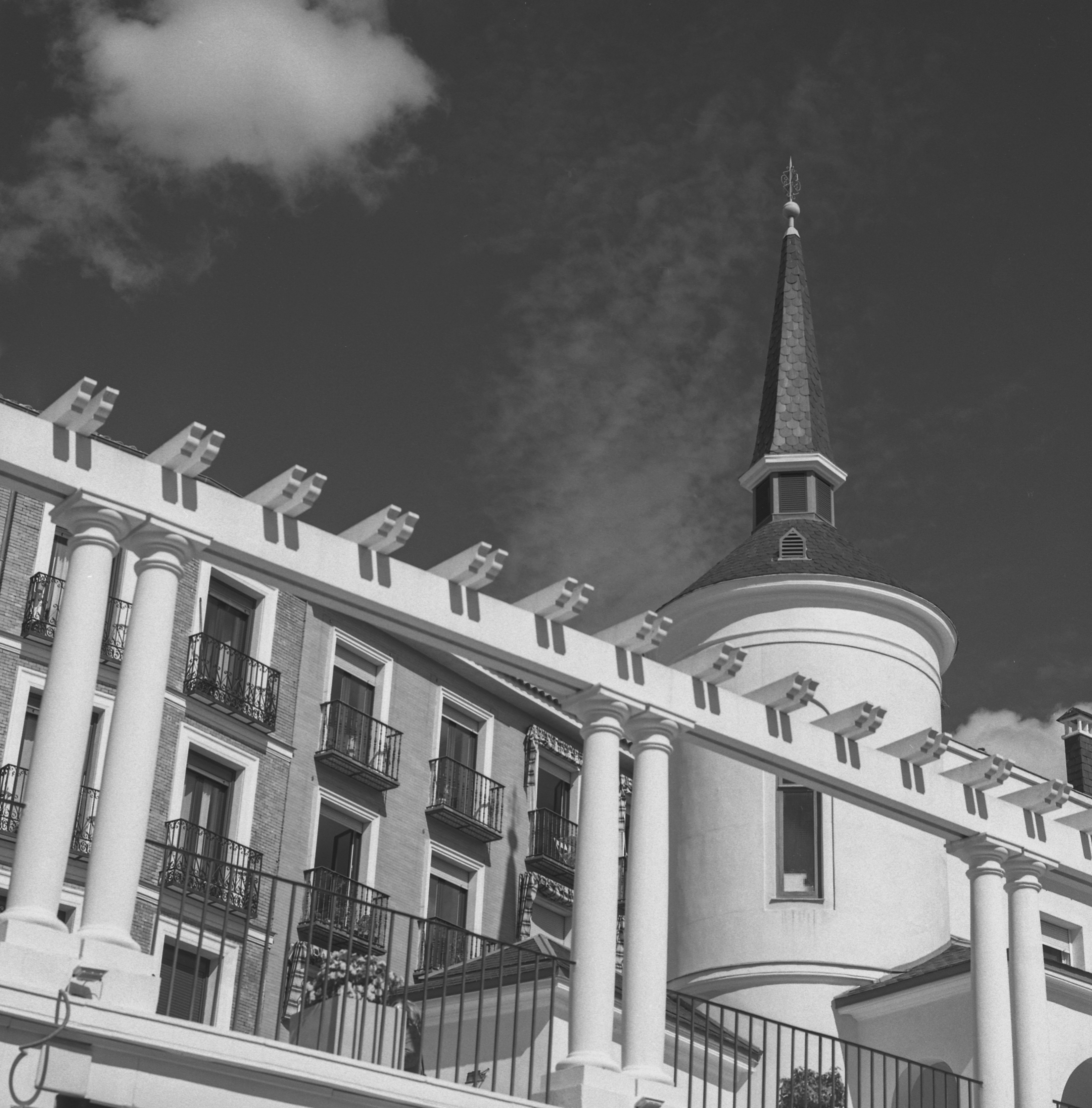 En el patio, y buscando la salida, cambio de objetivo, el 100mm (hasta ahora todas las fotos las había disparado con el 50mm) para buscar la pequeña atalaya de la calle Rodas y su gracioso chapitel (Rollei Retro 400s) …