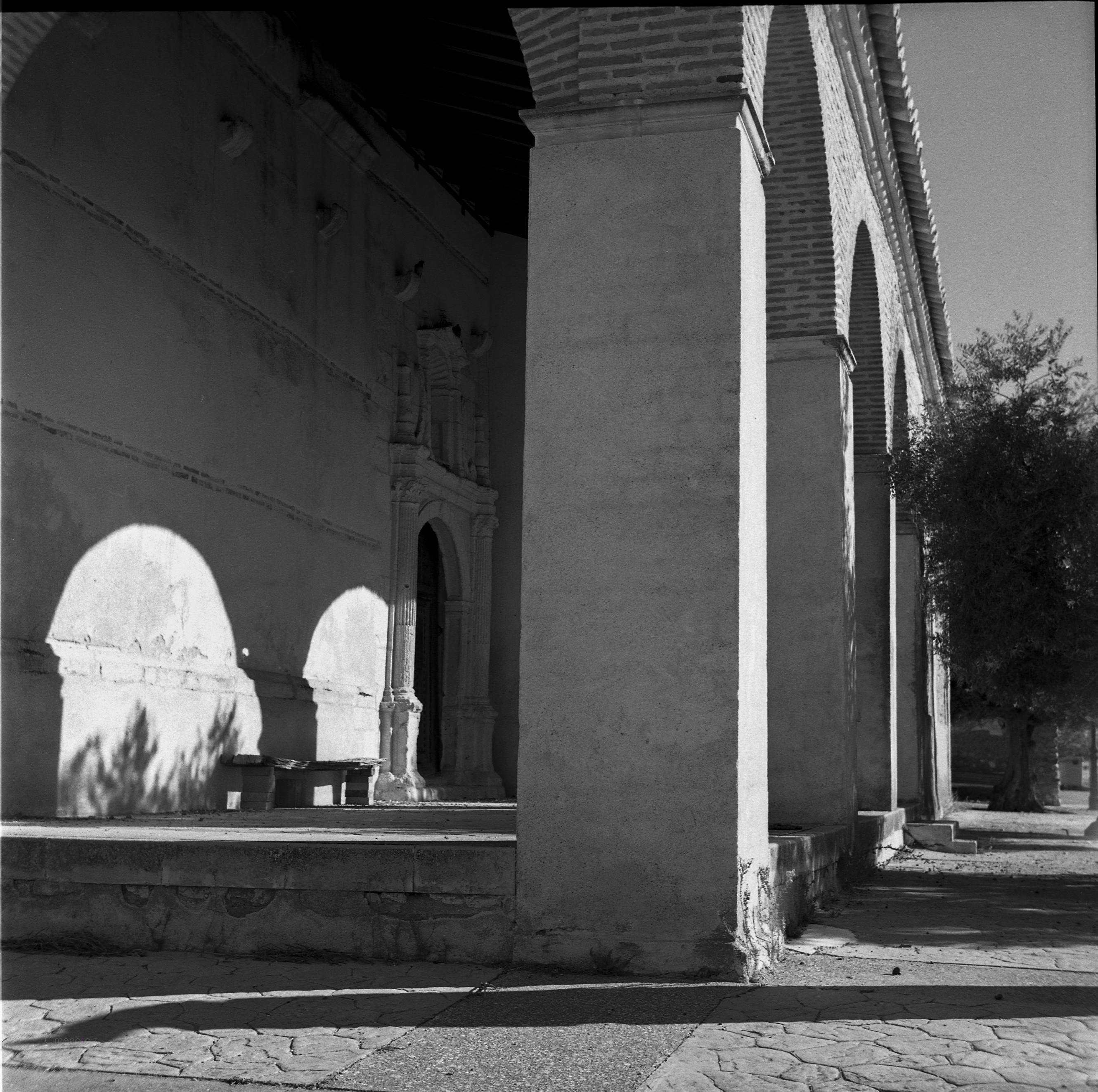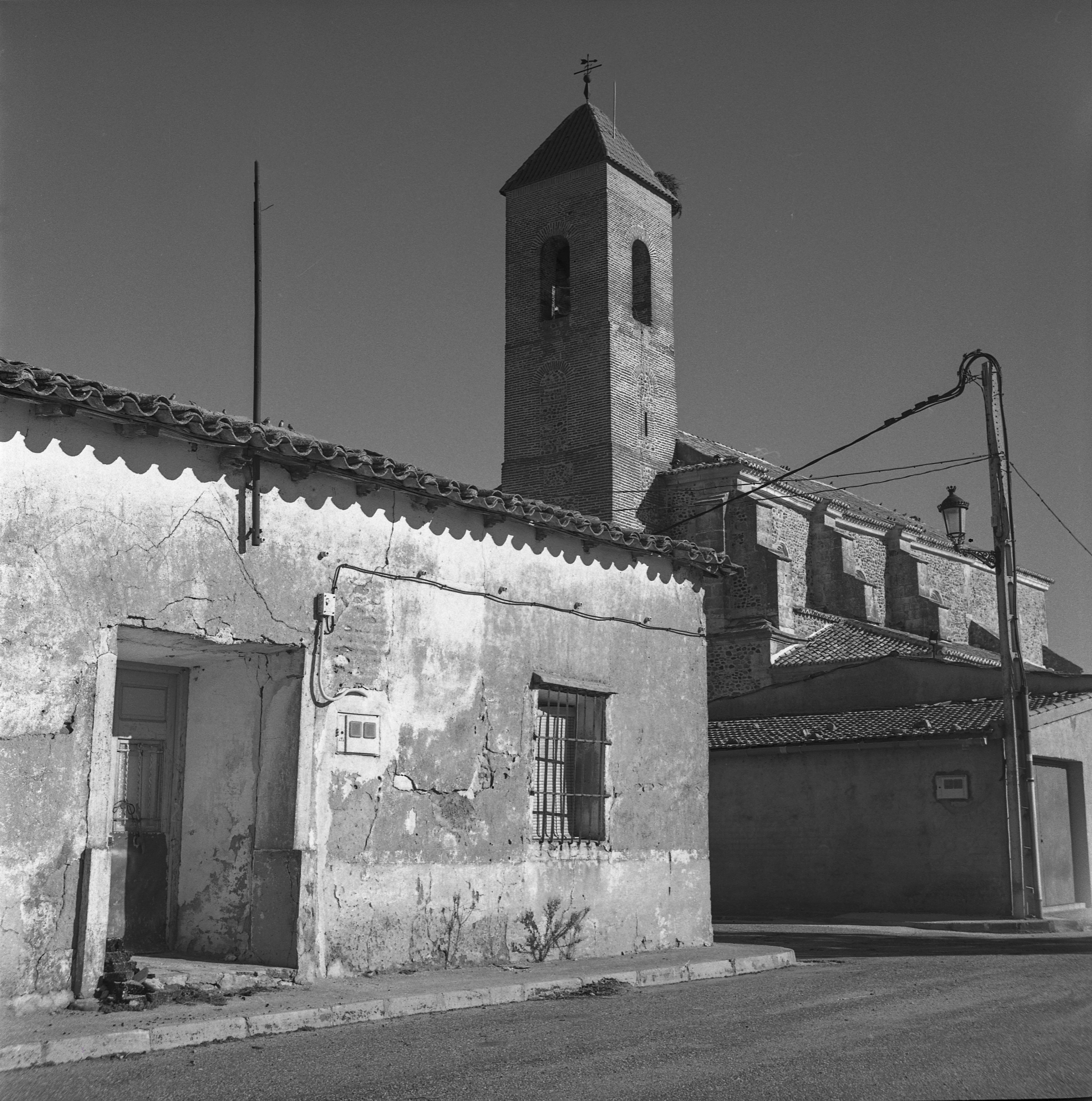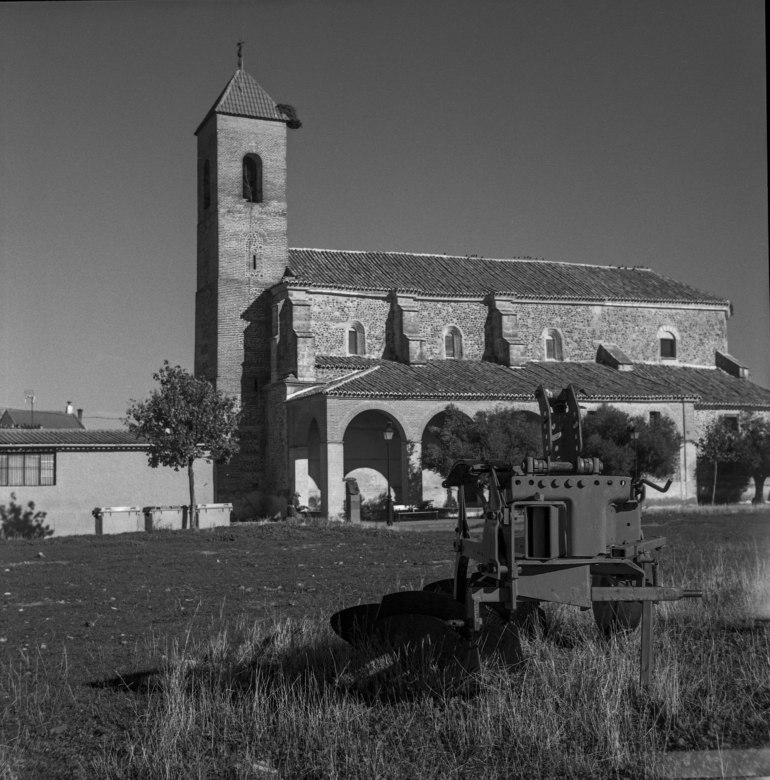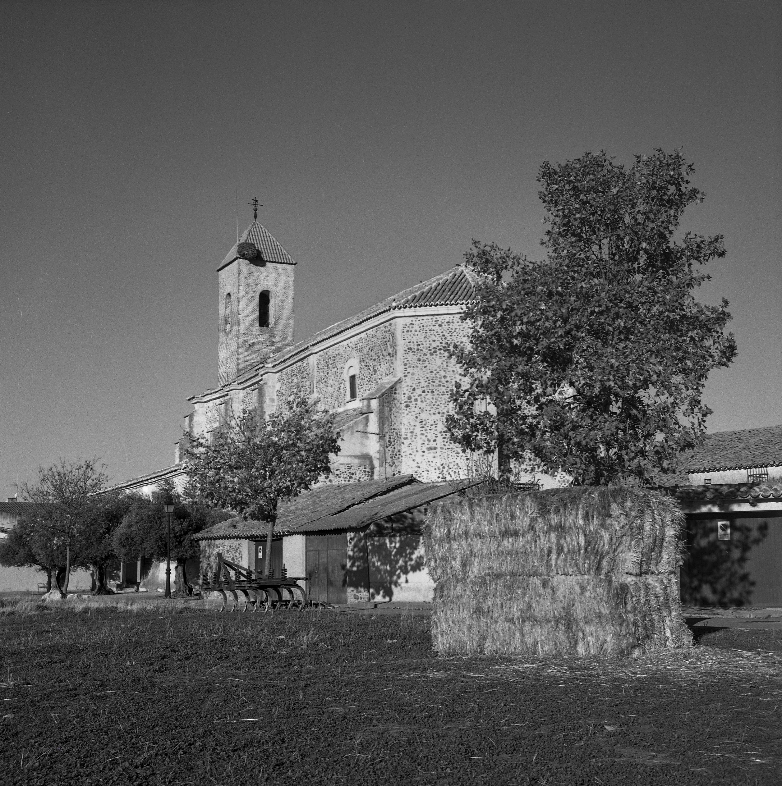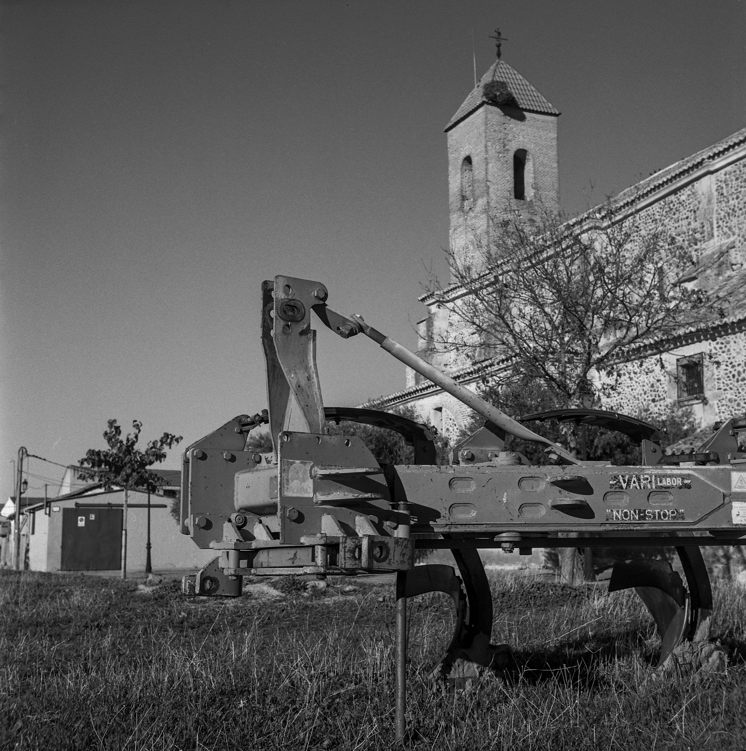 Vuelvo a detenerme en Casa de Uceda. La torre de la parroquia de San Bartolomé, que vislumbro apenas dejo atrás Villaseca, tiene un atractivo «proustiano», algo que quiero fotografiar pero no alcanzo. También me pasa con la espadaña de la iglesia del Santo Ángel, en esta Villaseca de paso. Volveré. Tal vez me falte un teleobjetivo más largo y un punto de vista menos amable. El caso es que llego a Casa de Uceda camino de las Rañas y con la intención de visitar Valdepeñas de la Sierra … pero me detengo, de nuevo, ante San Bartolomé. Mejor, frente a su ábside, en la era en la que pacen los arados y otras bestezuelas agrícolas…