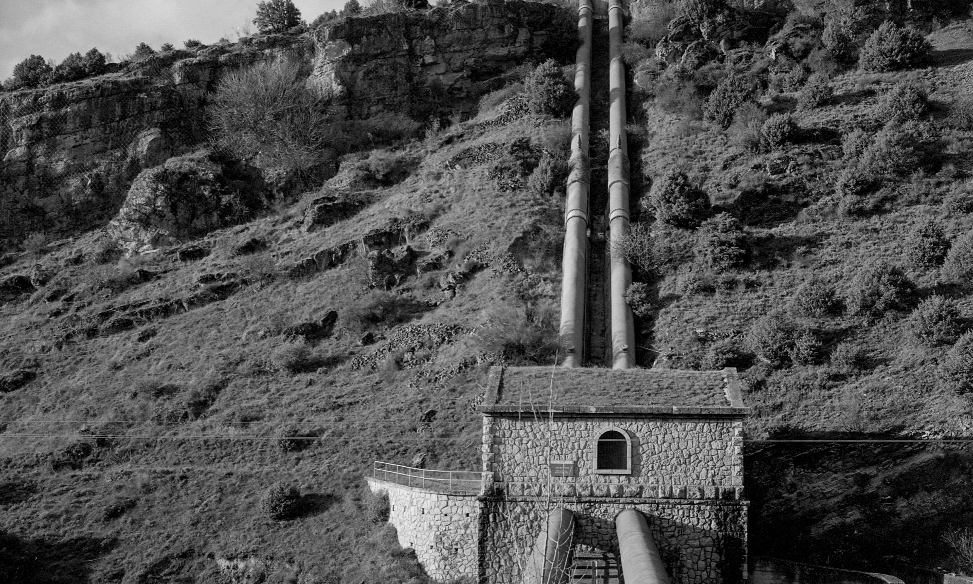 Elementos del Canal del Jarama fotografiados con Rolleiflex 3.5f disparando Rollei Retro 400s, sin filtro, revelado con HC-110 (h). La luz se hizo de rogar en una mañana que amenazaba lluvia sobre los cerros en los que se asienta Patones de Arriba. Se trata de las almenaras, sifones y el pontón del barranco de Patones …