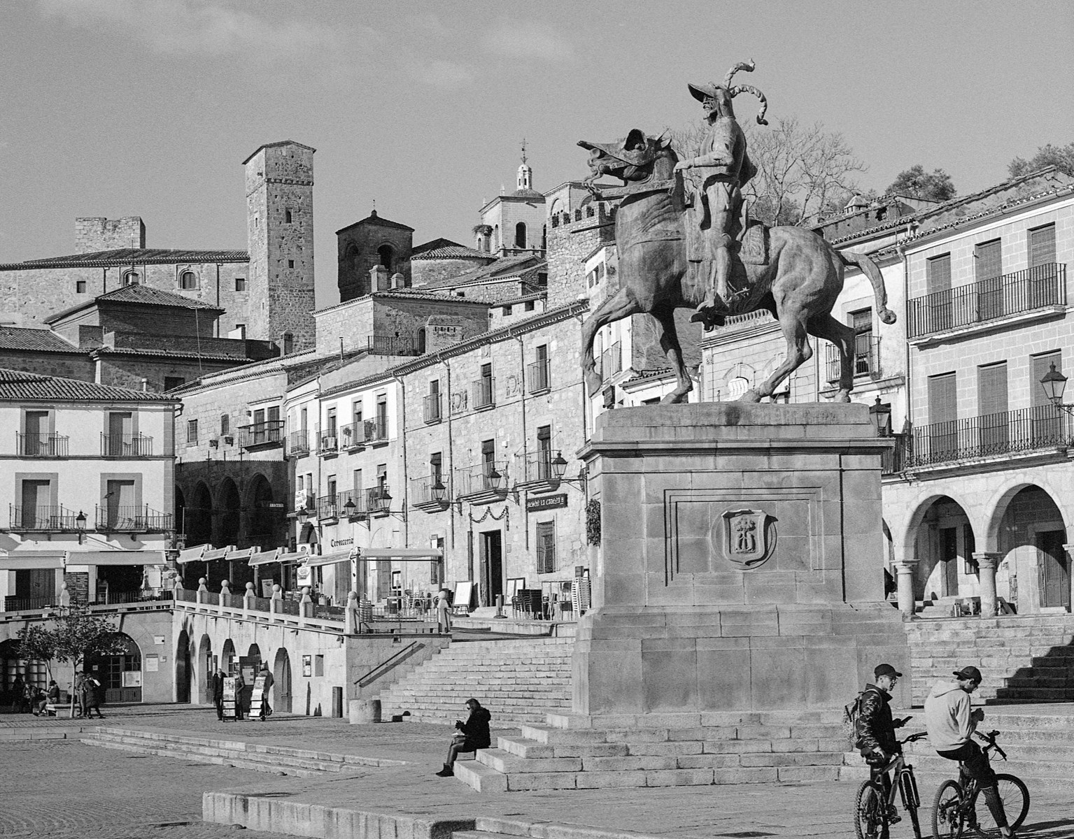 ¡Qué fotogénica es la Plaza Mayor de Trujillo! Los años, en especial aquel siglo XVI, le han sentado genial 😉 Del siglo XVI son los palacios que conforman su perímetro. Como el de los los Duques de San Carlos (o de los Carvajal Vargas), de impresionante sillería, en el que destaca la portada, sí, pero …